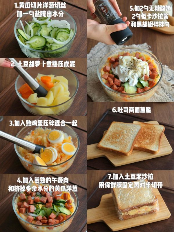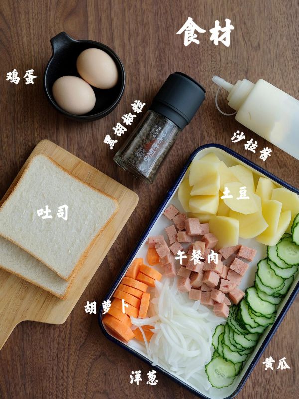 吐司2-4片、土豆2个、胡萝卜1根、黄瓜1/2根、洋葱1/3个、鸡蛋2个、午餐肉、黑胡椒、低卡沙拉酱、无糖酸奶
