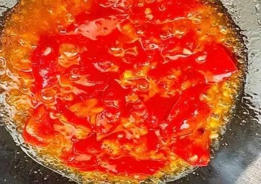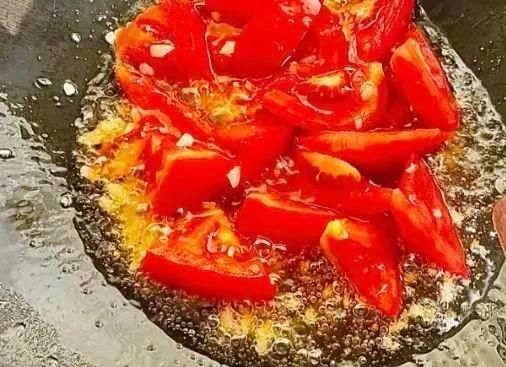 第二步,油热放蒜末爆香,下番茄块大火煸炒一会。