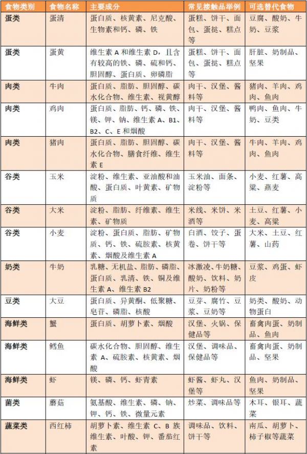 至于营养不良的问题我们更不需要担心,食物的营养成分很多,忌食某种食物可以通过进食其他食物**营养。为了方便大家的日常生活,我们特别总结出一份替代食品的《食物成分明细表》,希望给大家带来帮助: