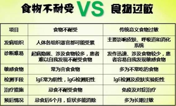 最后,有关食物过敏与食物不耐受的区别,不如让我们用表格对比的形式更为直观地展现,请看下图: