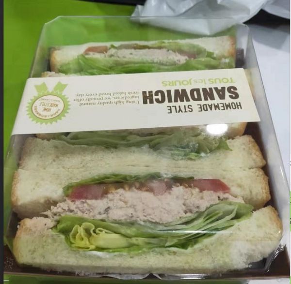 相反,三明治,很多人以为高热量的食物,其实并不一定,像这样的三明治,面包片是少油的,金枪鱼提供蛋白质,还有蔬菜,整体的碳水化合物适中,蛋白质也有,还有其他的成分,营养是相对比较均衡的,值得提倡。