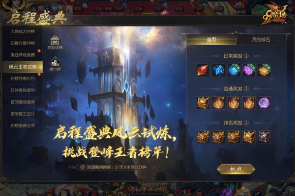 欢迎全职业身手不凡的勇士来参与风云王者试炼,挑战至高荣耀!风云竞技场共有100层,冒险者可不限次数地进行挑战。挑战成功后,勇士们的最佳挑战成绩将计入风云巅峰王者榜——全服全职业排行榜,并可领取每日奖励和对应精英层数的首胜奖励。