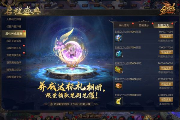 属性养成竞赛共三类:神火源力、封魔之力、圣装评分,各属性评分均设有达标奖励,步步有惊喜,将分别赠送圣权天炽自选匣【赠】、极品不朽洗炼石【赠】、神话圣锻武器箱【赠】等对应道具,辅佐您继续全面提升!奖励有限先达先得,请尽快提升吧!