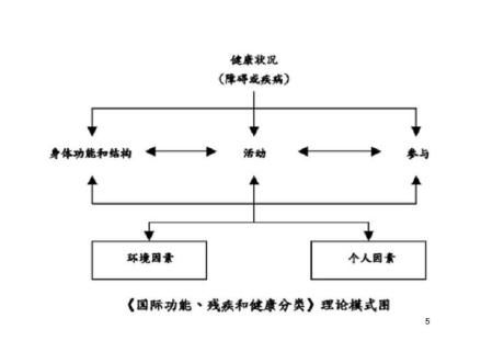 ICF将功能和残疾分类作为一种作用和变化的过程,提供多角度的方法。个体的功能状态是健康状况与情景性因素相互作用和彼此复杂的联系,干预一个项目就可能产生一个或多个项目的改变。这种相互作用通常是双向的。如《ICF理论模式图》所示: [1]