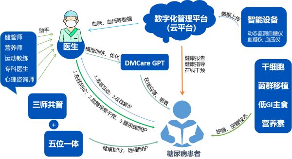 AI糖医以云平台为智能枢纽中心,链接糖友、医生、三师共管团队,通过运用新技术、实现远程问诊、健康管理方案执行、数据监控、健康宣教,有针对性地完成糖尿病逆转全过程。
