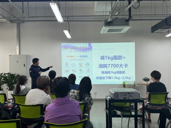 讲座中,黄圣明以其丰富的专业知识和实践经验,融合理论知识与现场实训,绘声绘色地为在场的教职工们普及了科学运动的重要性,并通过生动的案例向老师们介绍了减重的基本原理——“消耗大于摄入”。在实操环节,黄圣明推荐了具有较强燃脂效果的高强度间歇训练(HIIT)方法,并现场带领老师们一起体验融合了多种简单易学的办公室运动动作的燃脂训练方案。最后,他强调老师们应根据个人情况,合理搭配体能运动、轻断食等训练方案,长期坚持健康的生活方式,养好良好的运动习惯。