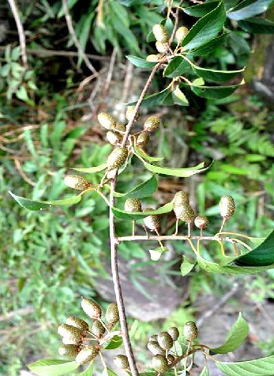 着花小枝密被锈褐色短茸毛,隔年枝灰褐色,秃净无毛,叶纸质,卵状椭圆形至椭圆披针形,顶端短尖至渐尖,基部钝形至楔尖,边缘小锯齿,腹面绿色,背面粉绿色,叶柄密被锈褐色茸毛。聚伞花序,有花,苞片钻形,花淡绿色,萼片卵形或长圆形,花瓣条状长圆形或瓢状倒卵形,花药长圆形,子房球形或卵形,果小卵形,绿色,秃净,有显著的浅褐色斑点,5 月中-6月中开花。11月果熟。
