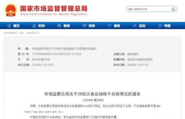 11月15日,国家市场监督管理总局公示了28批次食品抽检不合格情况。据庶正康讯了解,本次公布的不合格营养健康产品中主要为特殊膳食食品,没有保健食品不合格。
