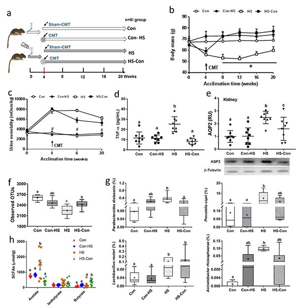 在这项工作中,研究人员通过对长爪沙鼠饲喂正常鼠饲料,分别进行4%或8%的高盐饮水处理4周诱导高盐缺水模型,以研究高盐缺水引起的肾脏和肠道生理和肠道微生态的变化;另外对8%高盐摄入的动物移植正常动物来源的肠道菌群,并继续饮用8%的高盐水,以研究正常动物的肠道菌群是否能够缓解高盐摄入引起的损伤。研究发现,高盐摄入导致动物的摄食量和饮水量明显降低,动物处于负能量平衡状态,并产生少量的高度浓缩尿;高盐动物通过提高肠道和肾脏组织上皮细胞中水通道蛋白2(AQP2)的表达增加细胞对水分的重吸收,降低α-钠通道蛋白(α-ENaC)的表达提高细胞的排钠能力。高盐摄入引起肠道菌群的多样性降低,菌群组成结构发生改变,特定细菌如理研菌属(Rikenella)和克里斯坦森氏菌(Christensenella,具有降低胆固醇功能)的相对丰度明显降低,而与炎症和结直肠癌有关的阿托波氏菌属(Atopobium)明显升高,血清炎症因子水平明显升高(图1)。菌群移植能够重塑肠道微生态,例如罗伊氏乳杆菌(Lactobacillus reuteri)明显升高,而狄氏副拟杆菌(Parabacteroides distasonis)和普雷沃氏菌属(Prevotella copri)相对丰度明显降低,这些特定细菌的变化伴随丁酸盐浓度明显升高,而乙酸盐浓度相对降低;移植正常菌群的高盐动物能量代谢、渗透调节和炎症水平等得以恢复或缓解(图2)。该研究阐明了“菌群—肠—肾”轴对荒漠啮齿动物耐受高盐的调节机制,揭示了肠道菌群与宿主的协同进化对动物能量代谢、水盐调节的重要生理意义,为人类高盐饮食对机体危害的预防和治疗提供理论依据和可能的干预措施。