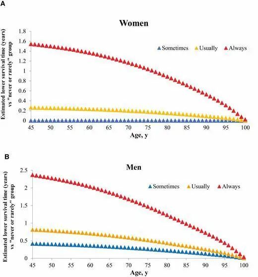 图源[6] 女性(A)和男性(B)从45岁起在食物中添加盐的频率与预期寿命呈正相关