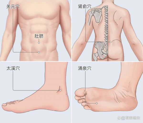 太溪穴:位于足内侧,内踝尖与跟腱之间的凹陷处。每天早晚用拇指指腹按压太溪穴,每次持续2至3分钟,力度以产生轻微酸胀感为宜,不仅能够促进局部血液循环,还能引火下行、 固肾强体。