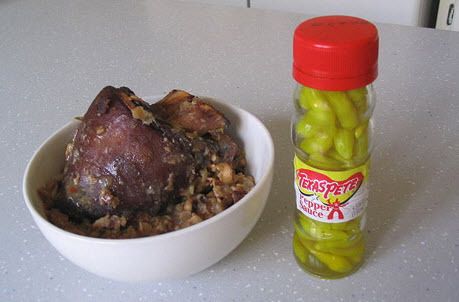 图4:传统新年菜式:黑眼豌豆,火腿肘加上辣椒酱