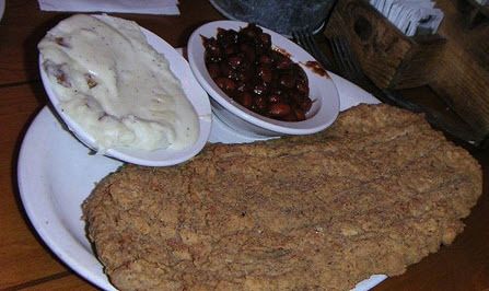 乡村炸牛排,也叫做“chicken fried steak”(牛肉上脆面粉高度油炸,通常和白肉汤一起上)