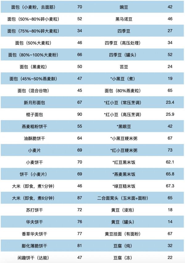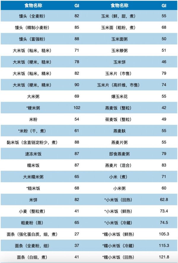 ①全谷物/粗杂粮的GI普遍低于精制谷物。前者指糙米、全麦粉、燕麦、玉米、荞麦、青稞、高粱米、藜麦、红豆、绿豆、扁豆、芸豆等;后者指白米饭、白馒头、白粥、白面条、白面包、饼干等,GI普遍较高。
