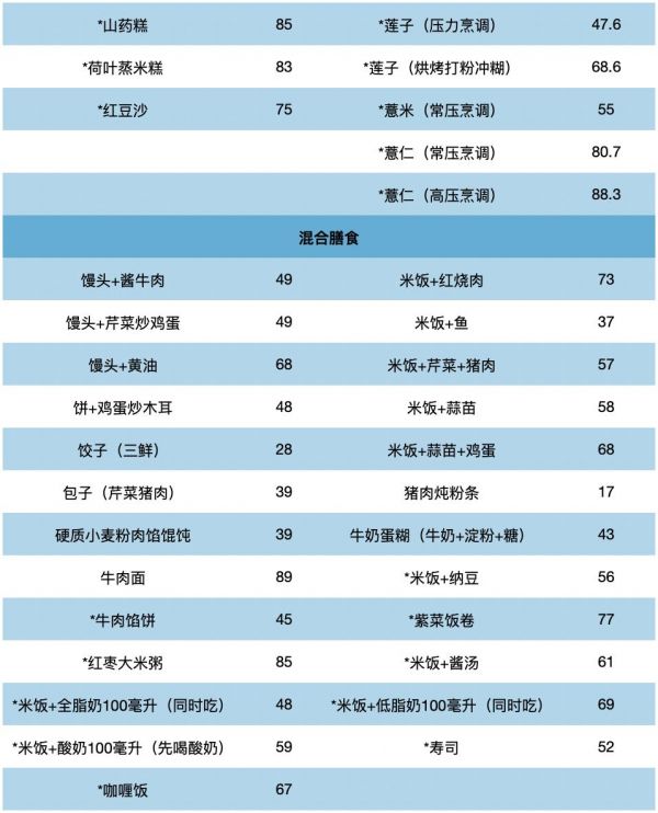 众所周知,即使是在碳水化合物摄人量相同的情况下,吃杂粮饭、全麦馒头的餐后血糖也要比吃白米饭、白馒头等低一些。这主要是因为杂粮饭、全麦馒头的消化吸收速度较慢。一种食物,尤其是高碳水化合物(糖类)的食物,消化吸收越慢,则餐后血糖水平越低。营养学上用血糖生成指数(GI)或称升糖指数来描述一种食物对餐后血糖的影响。GI越低,则消化吸收速度越慢,餐后血糖水平越低。