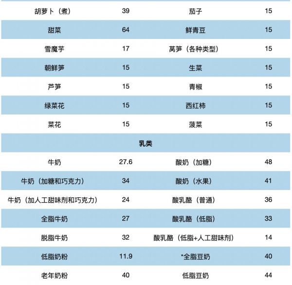 表 2-4 常见水果、蔬菜和乳类的血糖生成指数(GI)