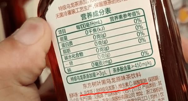 茶饮的品类是很多的,随手拿一瓶其他品牌的茶饮看一下配料表,水茶叶茶的浓缩汁,还有维生素C和小苏打,和东方树叶只差了一个浓缩汁。