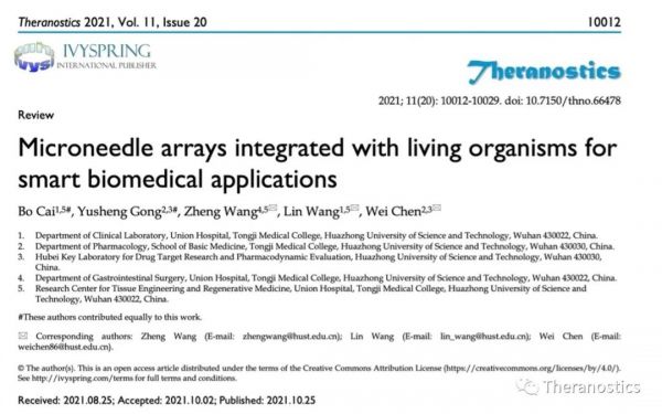 利用微针技术递送药物至局部组织,是一种微创、无痛、便利的治疗新模式,随着微针设计与构建的发展与创新,其中负载内容物逐渐丰富,从单一的药物到具有功能的亚单位和亚结构,再到多种多样的生物活体。过去,微生物或其他活物进入机体可能往往导致感染等不良反应,但其经改造后则能发挥修复损伤、增强免疫、编辑基因和治疗肿瘤等功能。近来,华中科技大学同济医学院基础医学院药理学系陈伟教授与附属协和医院王琳/王征教授团队合作在微针控糖贴片(Wei Chen,et al.Nat.Commun. 2017, 8, 1777),微针采样拭子(Wei Chen,et al.Matter 2020, 3 (5), 1589-1600)以及超强生物粘附微针药片(Wei Chen,et al., Sci. Adv. 2022, 8, eabk1792)等领域开展了一系列相关工作,并就当前搭载活物的微针技术在生物医学领域方面的研究作出综述,以期为微针递送领域提供全新的思路。该工作于2021年10月25日发表在1区医学期刊Theranostics (IF=11.56)上。