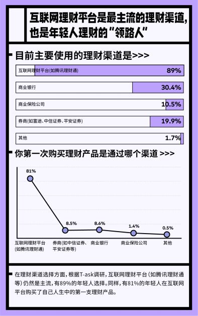 调研发现,互联网理财平台是年轻人最主流的理财渠道。有89%的年轻人选择了腾讯理财通等互联网理财平台,同时有81%的年轻人在互联网平台购买了自己人生中的第一支理财产品。互联网理财的低门槛、智能化服务、产品矩阵优势,以及与日常生活场景的结合,形成理财意识启蒙的天然场景,成为年轻人理财最直接的渠道。
