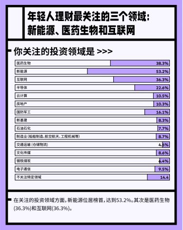 在理财领域方面,年轻人关注的投资领域较为前沿。新能源领域最受关注,关注该领域的年轻人占53.2%,其次是医药生物(36.3%)和互联网(36.3%)。与收益进行交叉分析,收益率最高(超过50%)的人群最主流的理财类型为股票及混合基金等,其最偏爱的投资领域是新能源;收益率最低、最主流的理财类型同样为股票及混合基金,其最偏爱的投资领域同样是新能源。这说明新能源领域对年轻人的吸引力大,但风险相对较高,收益率最高和最低的赛道都在新能源。