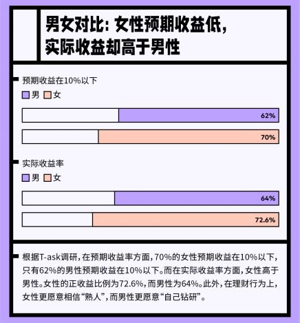 在理财收益方面,女性的收益预期更低,但实际收益率高于男性。在预期收益率方面,70%的女性预期收益在10%以下,只有62%的男性预期收益在10%以下。而在实际收益率方面,女性高于男性。女性的正收益比例为72.6%,而男性为64%。