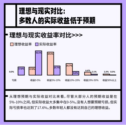 然而,即便大部分人的预期收益是在5%-10%之间,但实际收益大多集中在0-5%,并且实际亏损率达到了17.6%,多数年轻人都没有达到自己的理想收益。84.7%的年轻人表示能够接受暂时性的理财亏损,超过8成年轻人只能接受20%以下的本金亏损。