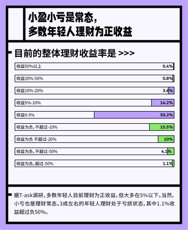 在理财目的方面,年轻人普遍较为乐观稳健。41.3%的年轻人希望能够“小赚一笔,见好就收”,35%的年轻人希望通过长期投资,实现“财富稳健增值”,也有22.2%的年轻人希望货币保值,不亏就好。相比之下,只有1.5%的年轻人希望“狠狠大赚,实现财富自由”。对预期收益的调研也体现了年轻人理性克制的特点。