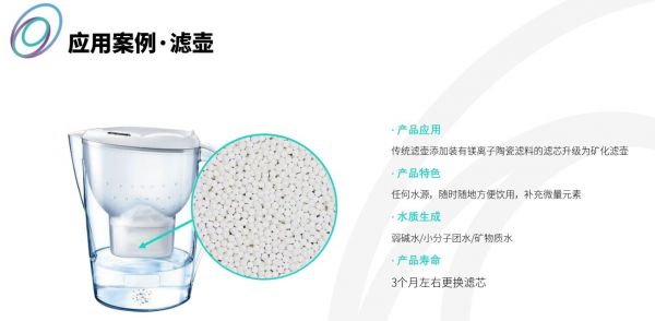镁离子陶瓷滤料采用天然矿物材料,应用最新采用全新鑫永恒LSR智能长效缓释技术以及梯度高温纳米微孔烧结工艺,具有使用寿命长、安全可控和成本低等特点,是一款新型高镁含量水处理材料,可应用于净水器滤芯、净水壶等饮用水设备产品上。