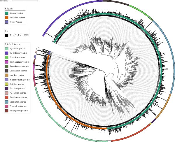图2. 不同真菌类群中的HGT分布