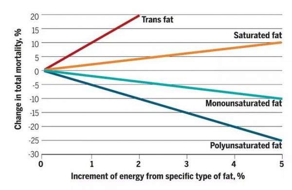 反式脂肪酸、饱和脂肪酸、不饱和脂肪酸、单不饱和脂肪酸和多不饱和脂肪酸(同碳水化合物相比)增加的摄入量与总死亡率的关系。数据基于对126233名男性和女性长达32年的跟踪调查,每四年评估一次。N-6多不饱和脂肪酸与总死亡率呈强烈的逆相关关系,N-3多不饱和脂肪酸则与总死亡率关联性较弱。图表数据来源:D. D. Wang et al., JAMA Intern. Med. 176, 1134–1145(2016).