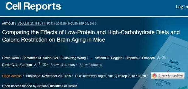 Comparing the Effects of Low-Protein and High-Carbohydrate Diets and Caloric Restriction on Brain Aging in Mice DOI:https://doi.org/10.1016/j.celrep.2018.10.070