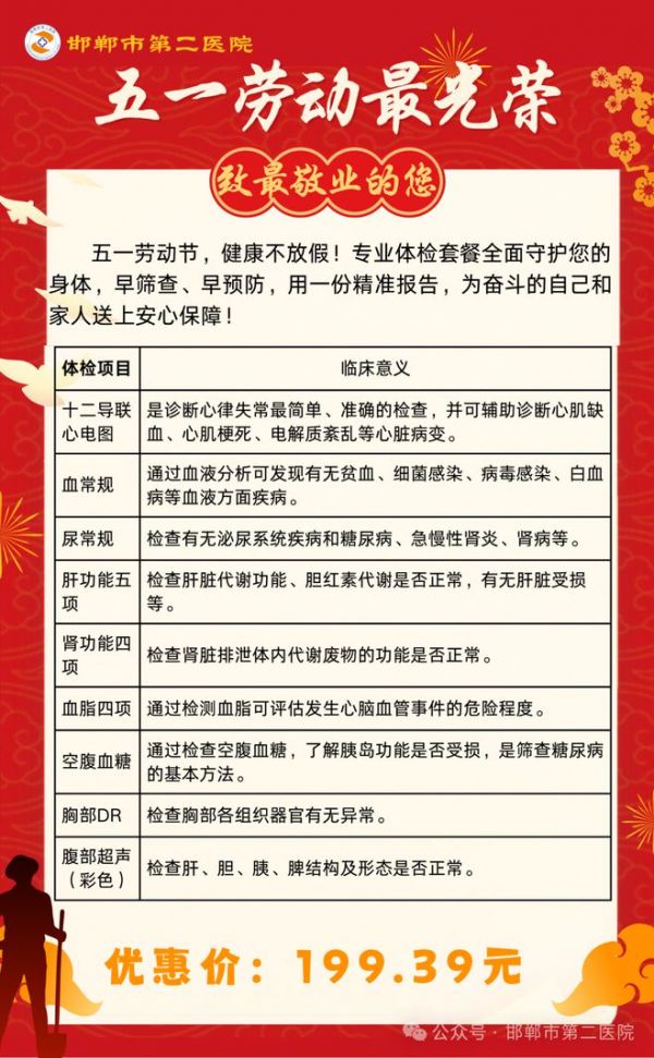五一劳动节,健康不放假!市第二医院体检科推出专业的特惠体检套餐,全面守护您的身体,早筛查、早预防,用一份精准报告,为奋斗的自己和家人送上安心保障!