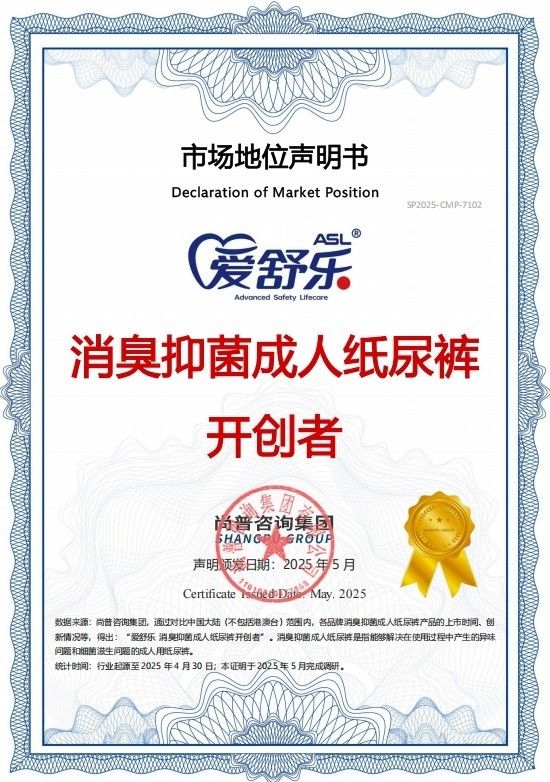 作为中国成人失禁用品行业十强企业、山东高新技术企业与专精特新企业、消臭抑菌型成人纸尿裤品类开创者,爱舒乐将继续秉承“爱在每一刻”的品牌理念,不断创新技术,提升产品质量,为更多长辈带来尊严与舒适的护理体验。在未来的日子里,爱舒乐将用科技的力量,守护每一位长辈的尊严与幸福。