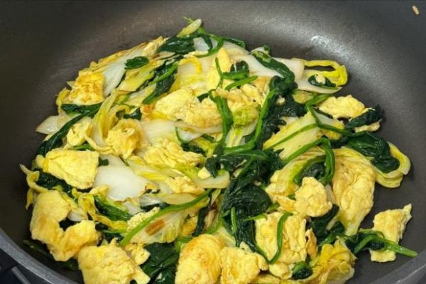4. 锅中再倒入少许油,放入菠菜翻炒至变软。将炒好的鸡蛋倒入锅中,与菠菜一起翻炒均匀,加适量盐调味即可出锅。