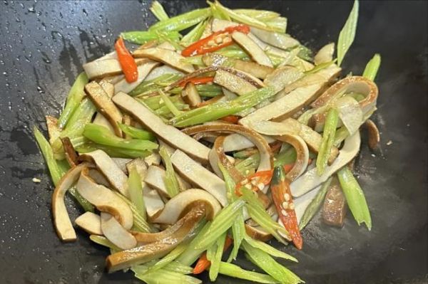 2.加入香干翻炒至微黄,放入芹菜段继续翻炒至变软。