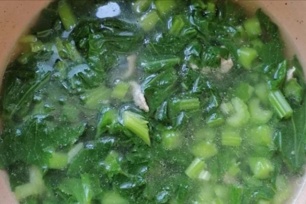3.放入芥菜段煮至变软,加适量盐和鸡精调味即可出锅。