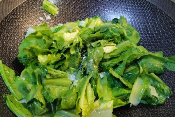 2. 热锅凉油,放入大蒜末爆香,加入莴笋叶翻炒至变软。