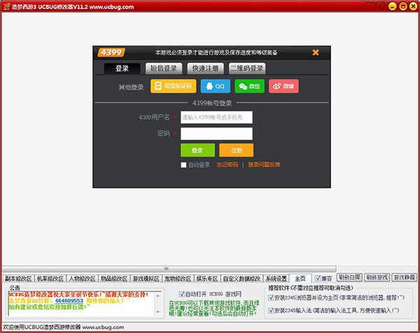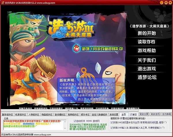 被大家所熟知的造梦西游3是一款由4399游戏发行的2D横版过关类动作页游,造梦西游3当中延续了造梦西游1和2的Q版卡通画面及形象,该版本内主要讲述大闹天庭剧情篇,玩家需不断通过完成天马行空的剧情任务,携手炫酷可爱的宠物进行战斗,各种颠覆游戏的线上即时PK,同屏聊天玩法为游戏增添极大乐趣。但由于在游戏当中对于部分玩家来说极为困难,因此小编带来了造梦西游3修改器ucbug,该修改器经由ucbug团队针对页游造梦西游3而设计打造,玩家可在修改器内开启一键秒杀、无敌、超强跳跃力、合成物品修改、爆率修改等等,玩家使用造梦西游3辅助器后能轻松闯关各种独特但却困难的关卡,完成游戏内各种剧情任务,操作起来简单易上手,下方小编奉上了详细的造梦西游3无敌秒杀版使用教程,喜欢玩造梦西游的玩家们千万不要错过了。