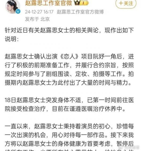 深入剧组内部探寻,会发现诸多问题。有爆料称,赵露思进组后拿到的剧本与签约前看到的版本大相径庭,剧情被改得面目全非。满心期待塑造经典角色的她,面对 “货不对版” 的剧本,试图与导演沟通,期望找回最初的感觉。可导演与制片人是夫妻关系,这层特殊关系仿佛一道屏障,让沟通变得艰难无比。赵露思的诉求被一次次忽视,制片人也未能站在她的角度考虑,无助与愤懑在她心中不断累积。