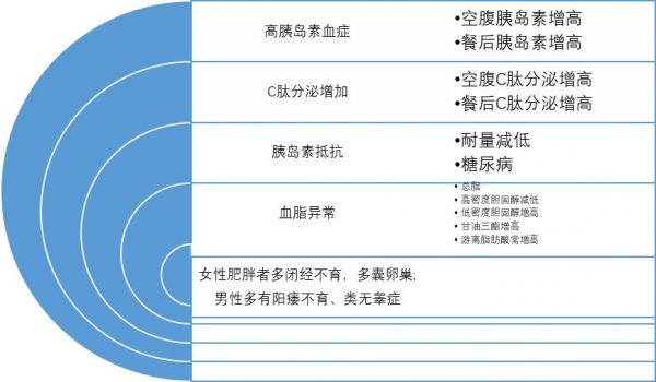 既具有高胰岛素血症,C肽分泌增加,同时又存在胰岛素抵抗,造成糖耐量减低或糖尿病。总脂、胆固醇、甘油三酯及游离脂肪酸常增高,呈高脂血症及高脂蛋白血症,成为动脉粥样硬化、冠心病、胆石症等病的基础。肥胖者血浆总蛋白、白蛋白、球蛋白 通常在正常范围,某些氨基酸可增加。