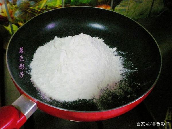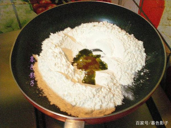 制作:用平底锅制作炒面,2杯面粉倒入锅内,一定开小火炒面哈。面粉的营养也不错