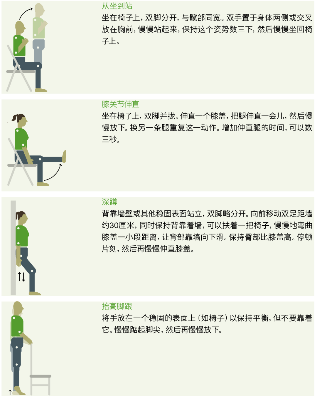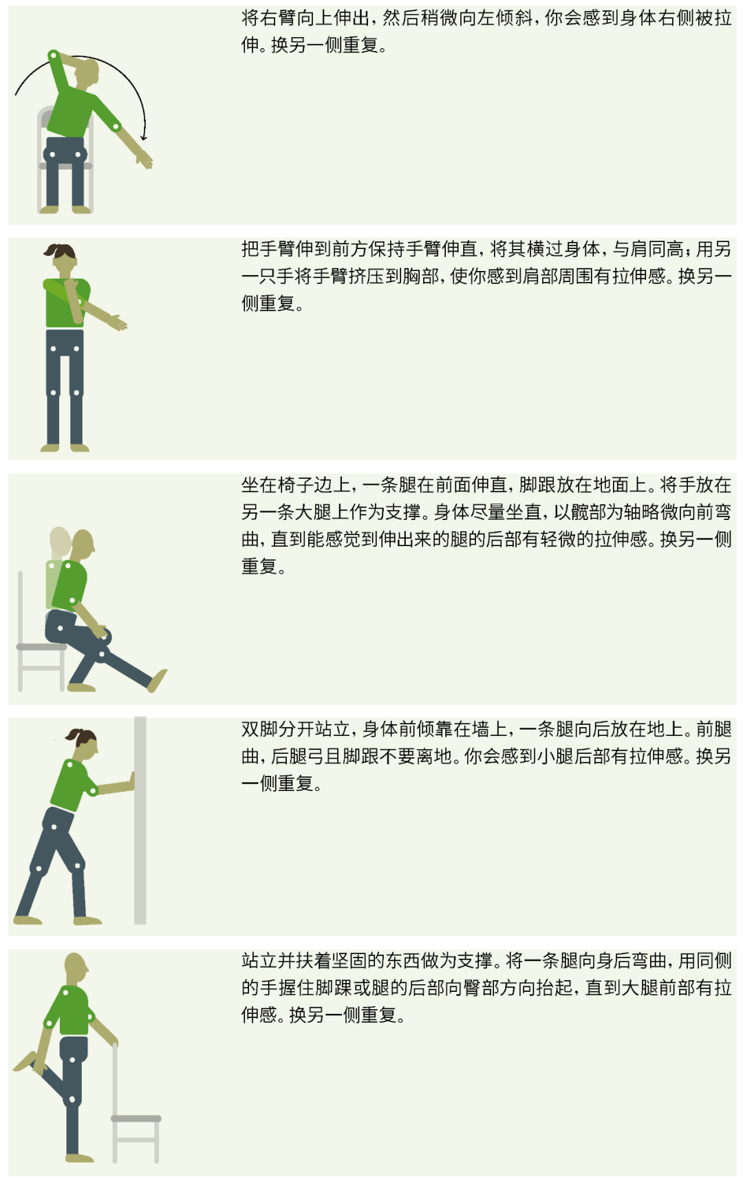 运动选择: 有控制的呼吸练习、散步、拉伸、平衡性练习15-20分钟,如果对上述任何活动你的RPE得分超过1,就不要在本阶段做这些活动了。可以坐或站着时拉伸你的肌肉。每一次拉伸都应轻柔地进行,而且每一次都应保持15-20秒。保持这些练习7天后进入下一阶段。