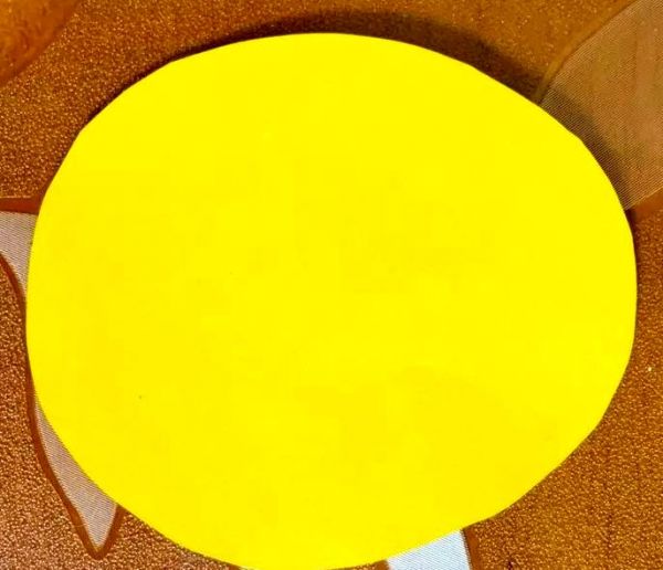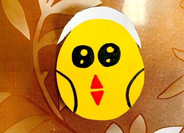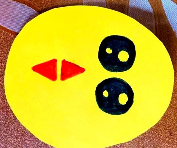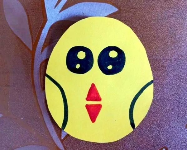 接着,从黄色卡纸上剪出一个椭圆形,这将是小鸡的身体。之后,在这个椭圆形上,我们可以随意地勾勒出小鸡的眼睛和嘴巴的形状。