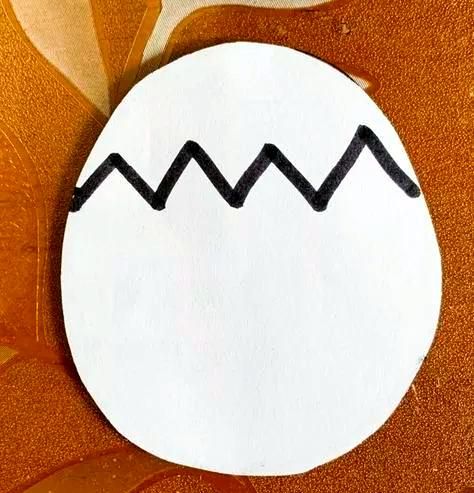 在小鸡身体的两侧,各画一个半圆形的翅膀。这样,小鸡就更加生动可爱了。选取两个白色的蛋壳,在它们的顶部以波浪线勾勒,再沿着线条剪出锯齿状的边缘。