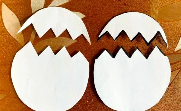 首先,从白色卡纸上剪下两个椭圆形,这些将作为我们小鸡的蛋壳,请妥善备用。