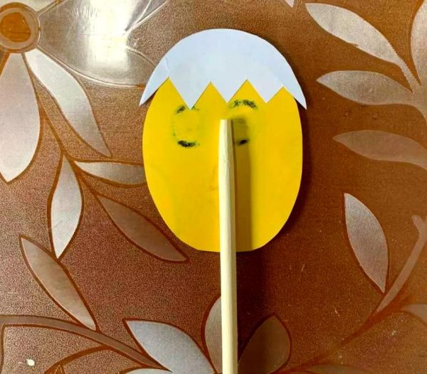 将胶棒涂抹在蛋壳的上半部分,然后细心地将其粘贴在小鸡的头部,注意正反面都要涂抹并贴合。将一次性筷子(或吸管)紧贴小鸡身体的背部,以确保其稳固。