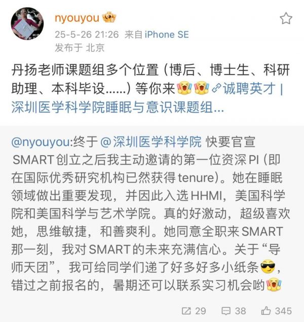 「她在睡眠领域做出重要发现,并因此入选 HHMI,美国科学院和美国科学与艺术学院。真的好激动,超级喜欢她,思维敏捷,和善爽利。她同意全职来 SMART 那一刻,我对 SMART 的未来充满信心。」