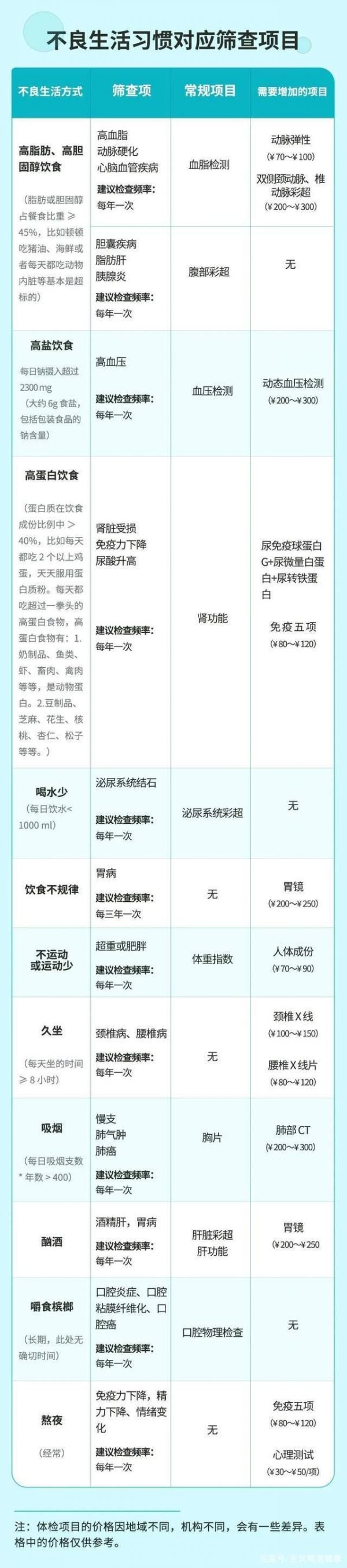 与不良生活方式对应的体检项目我已经做成了一张清单,需要的时候你可以对照查看,我这里就不一一讲解了。