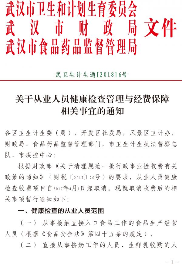 根据市卫计委、市财政局、市食药监局《关于从业人员健康检查管理与经费保障相关事宜的通知》(武卫生计生通【2018】6号)精神(2018年2月1日起实施),现将健康检查相关事项告知如下: