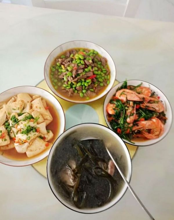 3菜一汤,经典的家常菜晚餐。毛豆炒肉,炒大虾,炒地方,再搭配一大碗海带鸡汤,这样的晚餐,在南方很常见吧?清淡不失美味和营养,做法简简单单,吃起来可口,很符合家人的口味,这样的晚餐南方真爱啊!
